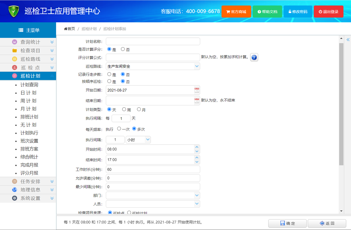 巡检计划是指:安排指定的人员,在指定的时间内,到达指定的巡检点,完成指定任务的巡视检查工作。分为日计划、周计划、月计划、排班计划、无计划五种类型,下面以日计划为列进行说明,其它类型的巡检计划请参考帮助文档。