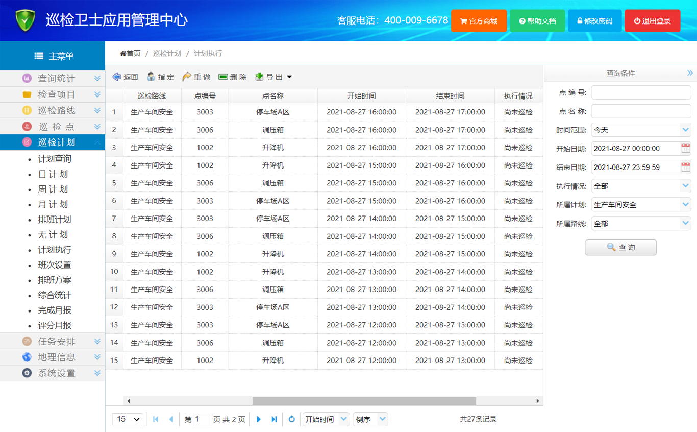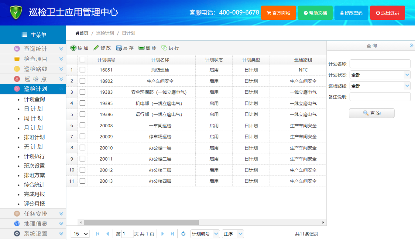 登录应用管理中心,在主菜单中点击【巡检计划】,再点击【日计划】进入巡检日计划设置页面: