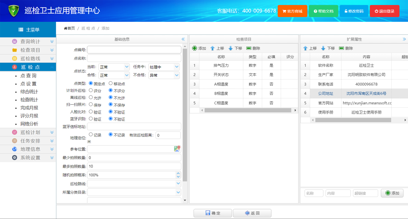 登录应用管理中心,在主菜单中点击【巡检点】,再点击【点设置】进入巡检点设置页面: