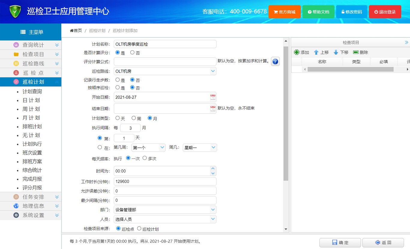 这个计划在每个季度最后一天生成下个季度的具体执行数据,90天完成所有巡检即可,设备管理部的任何一人去巡检均算有效。如有漏检发生,默认情况下,在巡检情况统计分析中只能看到设备管理部的漏检情况,具体是哪一个人漏检的,需要管理人员再检查具体的工作安排,事后可以在计划执行情况中为漏检记录“指定巡检人员”。