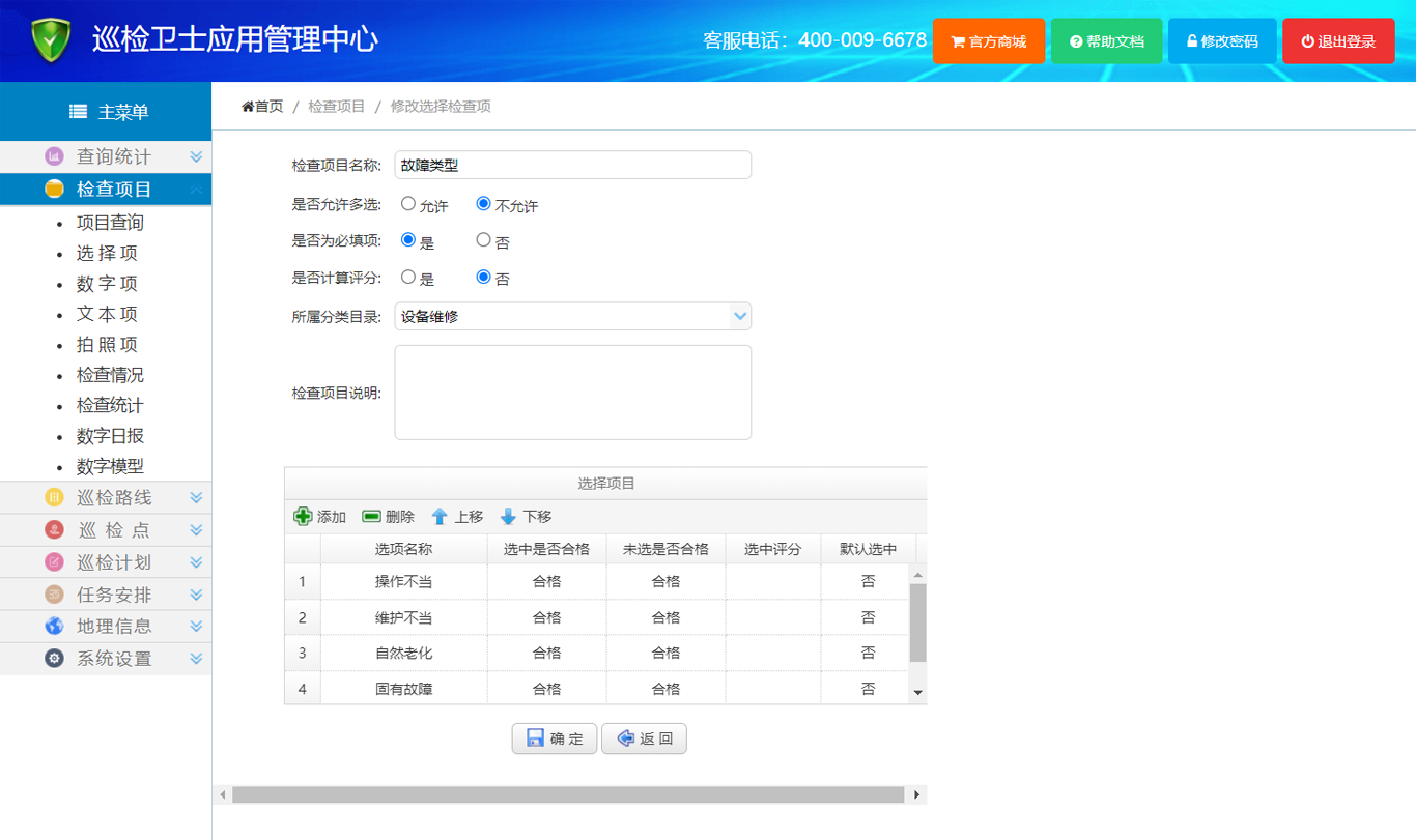3、在选择项设置页面,工具栏上点击【添加】,新建一个检查项,检查项目名称填写“故障类型”,是否允许多选选择“不允许”,所属分类目录选择“设备维修”,选择项目中添加“操作不当、维护不当、自然老化、固有故障、其它故障”,然后点击【确定】按钮,保存数据。