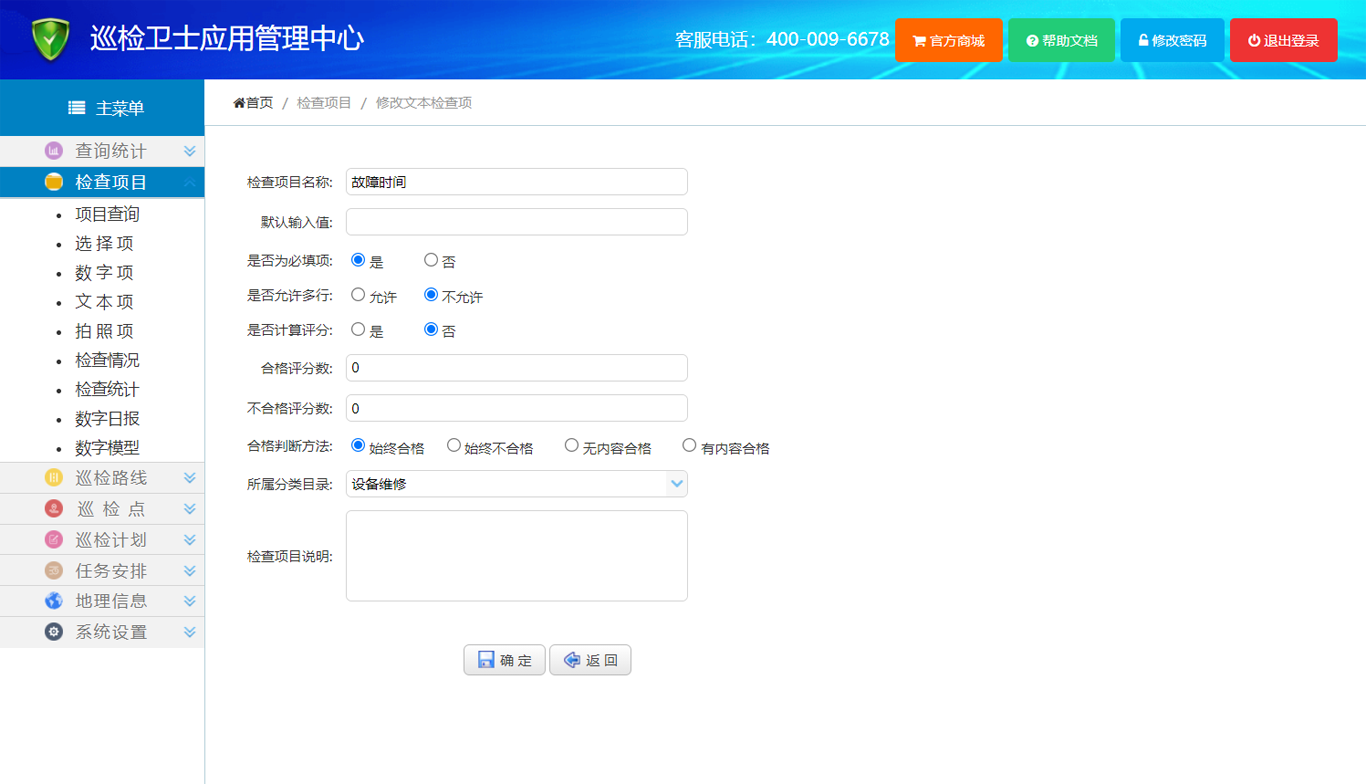 4、在左侧主菜单中点击 【检查项目】,再点击【文本项】,进入文本项设置页面,工具栏上点击【添加】,选择“文本项”,新建一个检查项,检查项目名称填写“故障时间”,所属分类目录选择“设备维修”,然后点击【确定】按钮,保存数据。重复上面操作,创建“故障现象、维修项目、维修人员、维修时间”文本检查项。