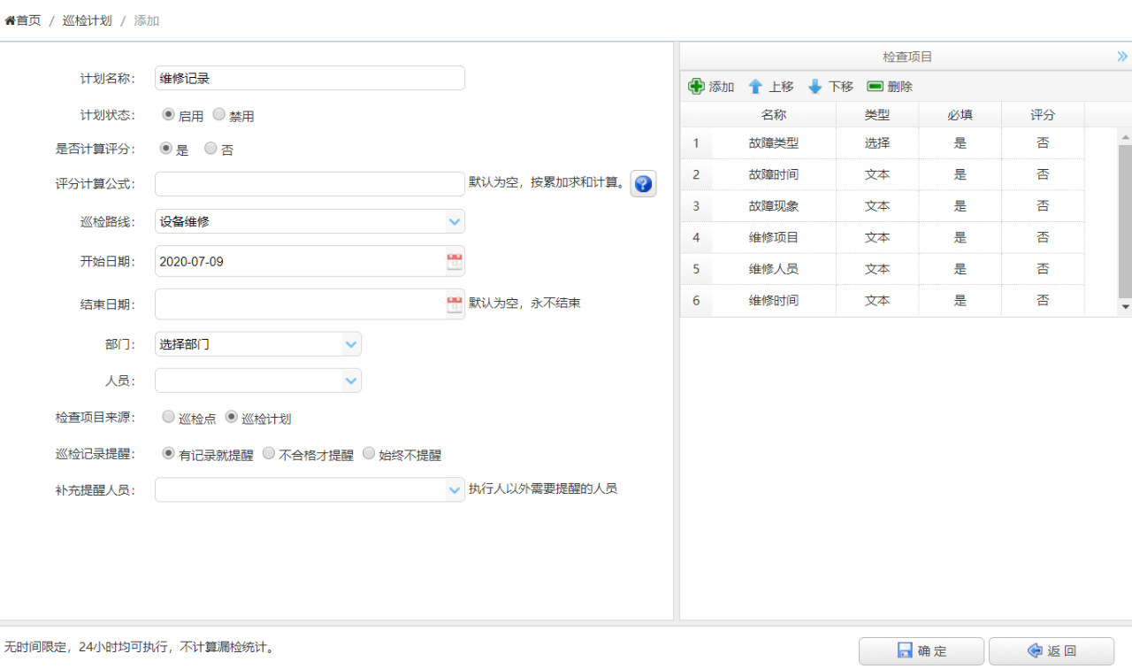 6、在左侧主菜单中点击 【巡检计划】,再点击【无计划】,进入无计划设置页面,工具栏上点击【添加】,新建一个计划,计划名称输入框填写“维修记录”,巡检路线选择“设备维修”,检查项目来源选择“巡检计划”,在右侧检查项目中依次添加第3步、第4步中创建的检查项目,最后点击【确定】按钮,保存数据。