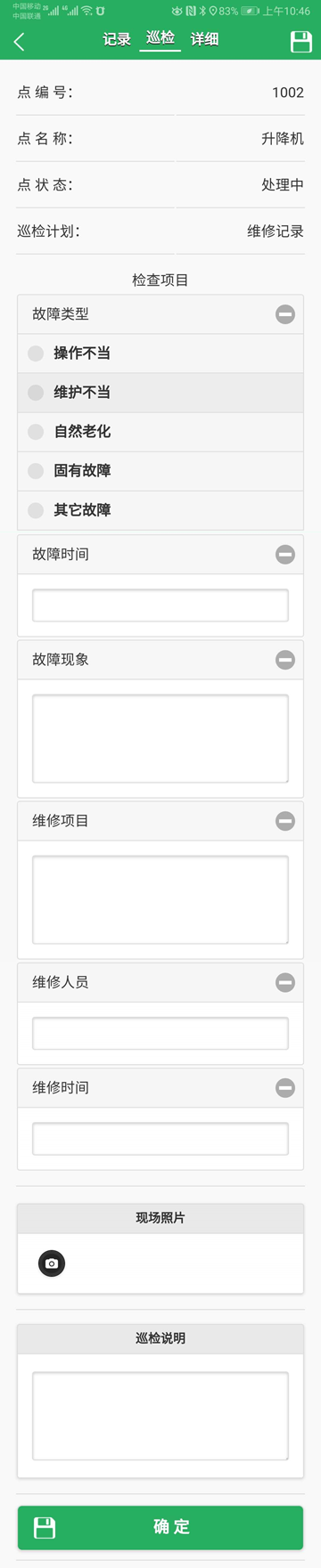 7、无计划巡检没有时间限定,24小时均可执行,不计算漏检统计。设备维修完成后,维修人员在现场扫描设备二维码巡检牌,选择维修记录巡检计划,进入维修记录页面,如下图所示: